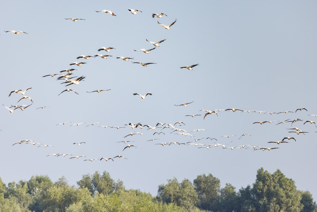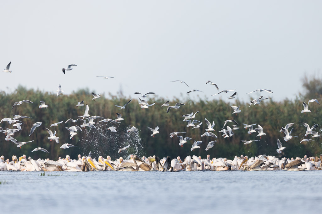 You frequently come across single or small groups of pelicans all over the delta. The real treat is to see a fleet of hundreds, even thousands of pelicans feeding together. The pelicans hunt together with cormorants to round up shoals of fish in the shallow water. The pelicans bashing their wings against the water to startle the fish and the cormorants’ diving under catching fish and driving the shoal up towards the pelicans who fill their great beaks full of fish. This writhing mass of hunting birds completely oblivious to the photographers floating nearby.