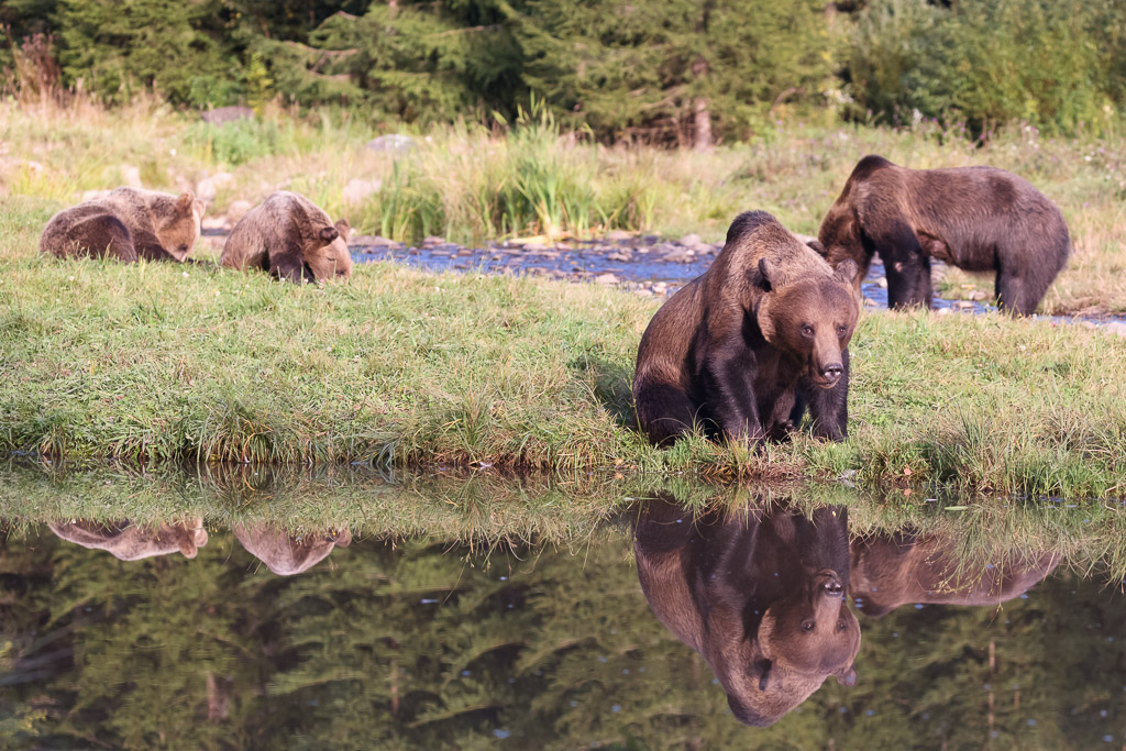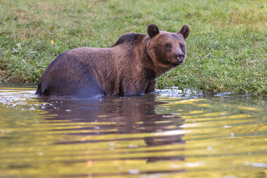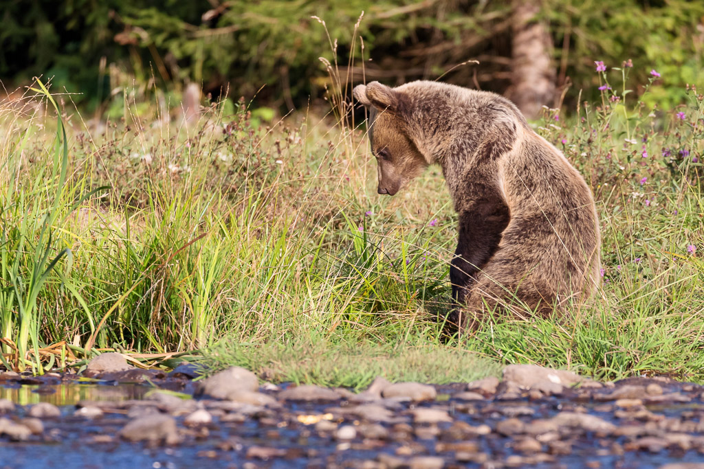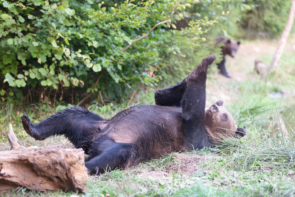 The second day we went to a more remote and our favourite hide. An hours drive on a dirt track through the forest and up into the mountains. The hide is on the edge of a grassy clearing with a stream running through it and a pond right in front of the hide. The clearing has an automatic feeder rigged that every day at 3pm starts spinning and nuts and seeds shoot out. We were told that it took two years for the bears to get used to this feeding ground and come check for food. But they certainly come now.