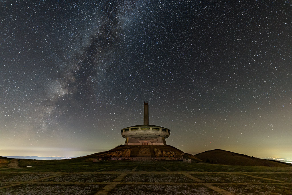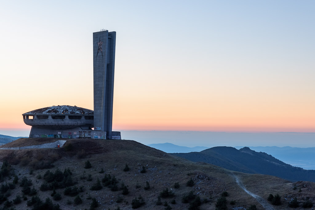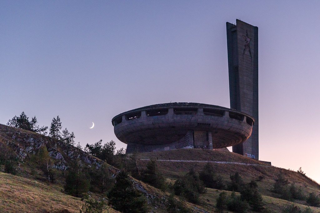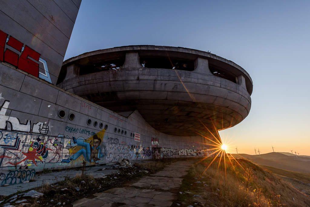 Buzludzha, also known as Khadzhi Dimitur was built on a remote mountain top location that in 1891 was the meeting place of a group of Socialists to plot a new socialist future for Bulgaria. Their movement eventually resulted in the formation of the Bulgarian Socialist Democratic Party, and then the Communist Party. Tasked with designing a monument that could be a meeting place for the Communist party. The architect Stoilov created a timeless if spacelike design that incorporated both ancient and futuristic motifs. Both the Roman Pantheon and the sci-fi films of the 1950s are listed amongst his inspirations for Buzludzha.