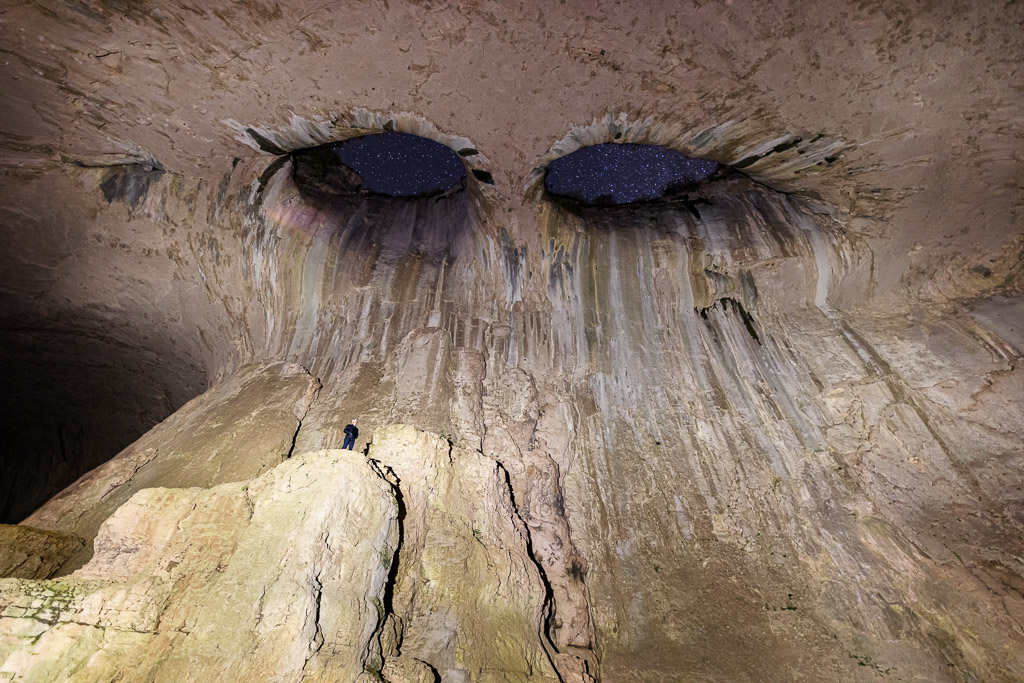 The surrounding land is flat farmland, approaching the cave you would have no idea that it was there. The cave itself has formed through limestone karst collapsing over time. It is a big open cave with two large entrances. Most notable are the two eye-shaped holes in the ceiling of this vast cavern, which earnt it its name. The eyes even have watermarks from the rain giving them an impression of eyelashes with smudged mascara.