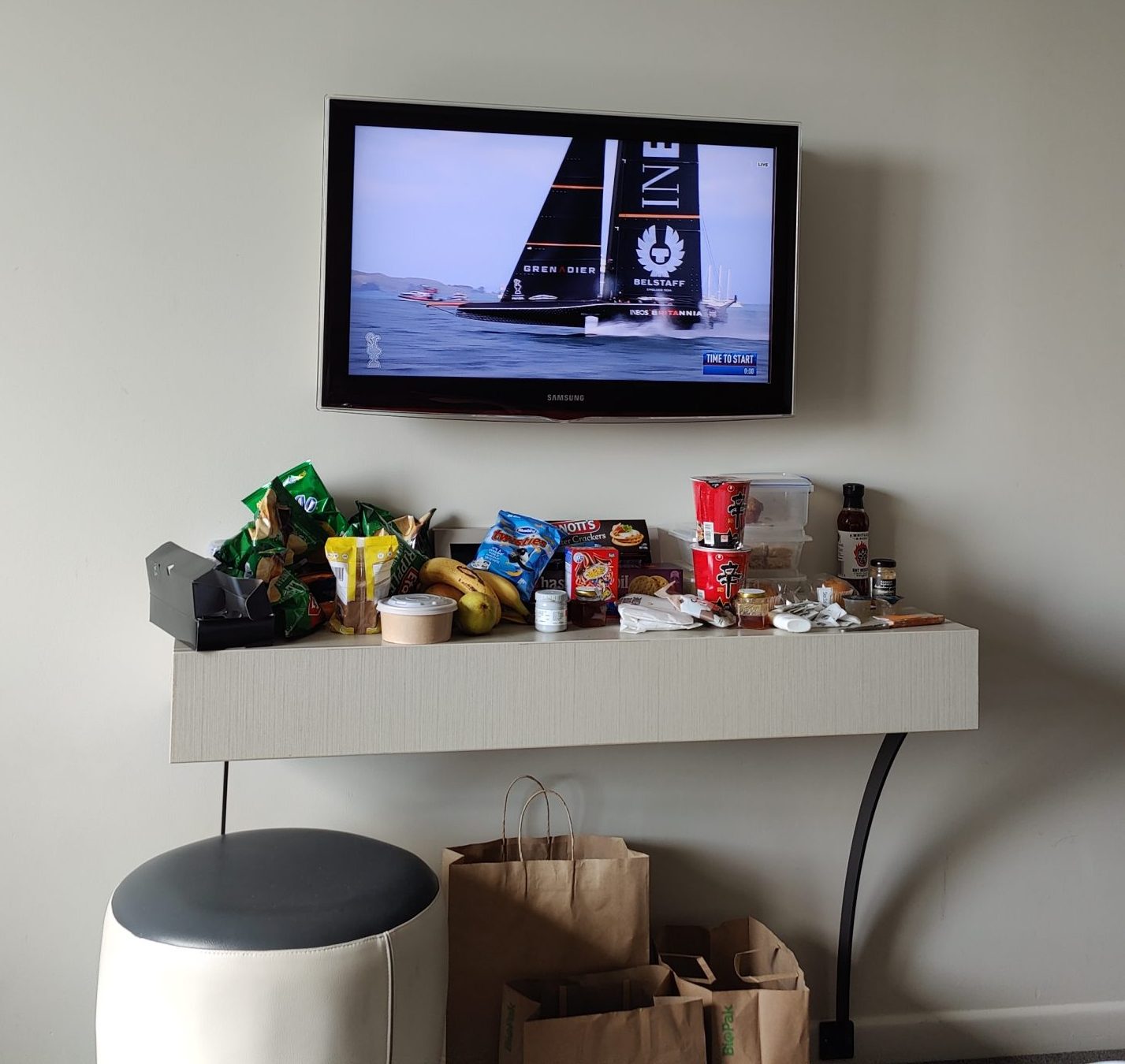 Bubble by bubble, we are waved off the bus to check-in. Five minutes later and we are on the sixth floor opening the door to our home for the next two weeks. It is a nice size room, big comfortable bed, a decent fridge, and a yoga mat in the corner. Slight disappointment at the uninspiring view our the back of the motorway and DHL warehouses. I had of course been secretly hoping for a view of Auckland Bay and the chance to catch sight of America’s Cup yachts practising! However, we were lucky as sunlight streams through the window for half the day!