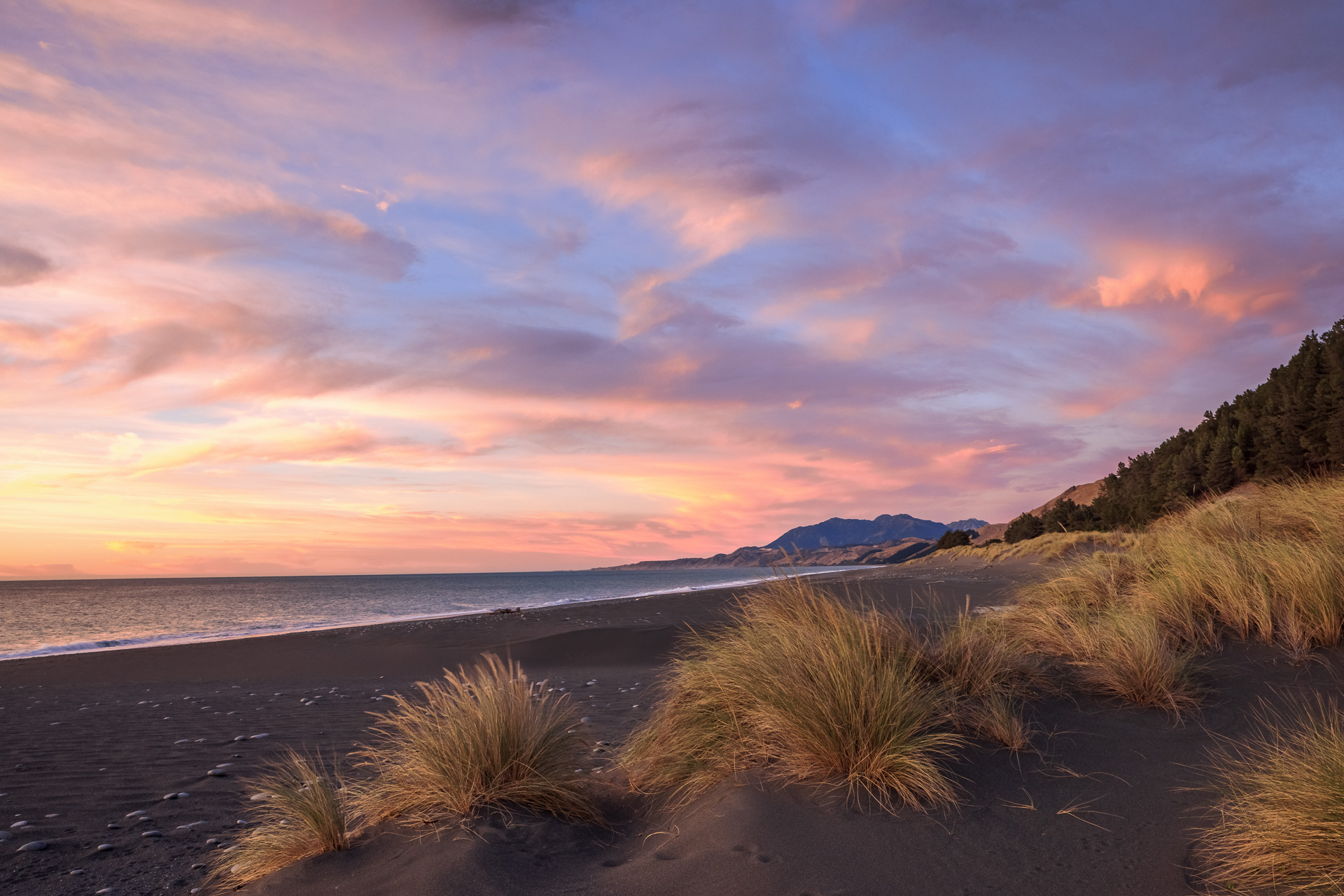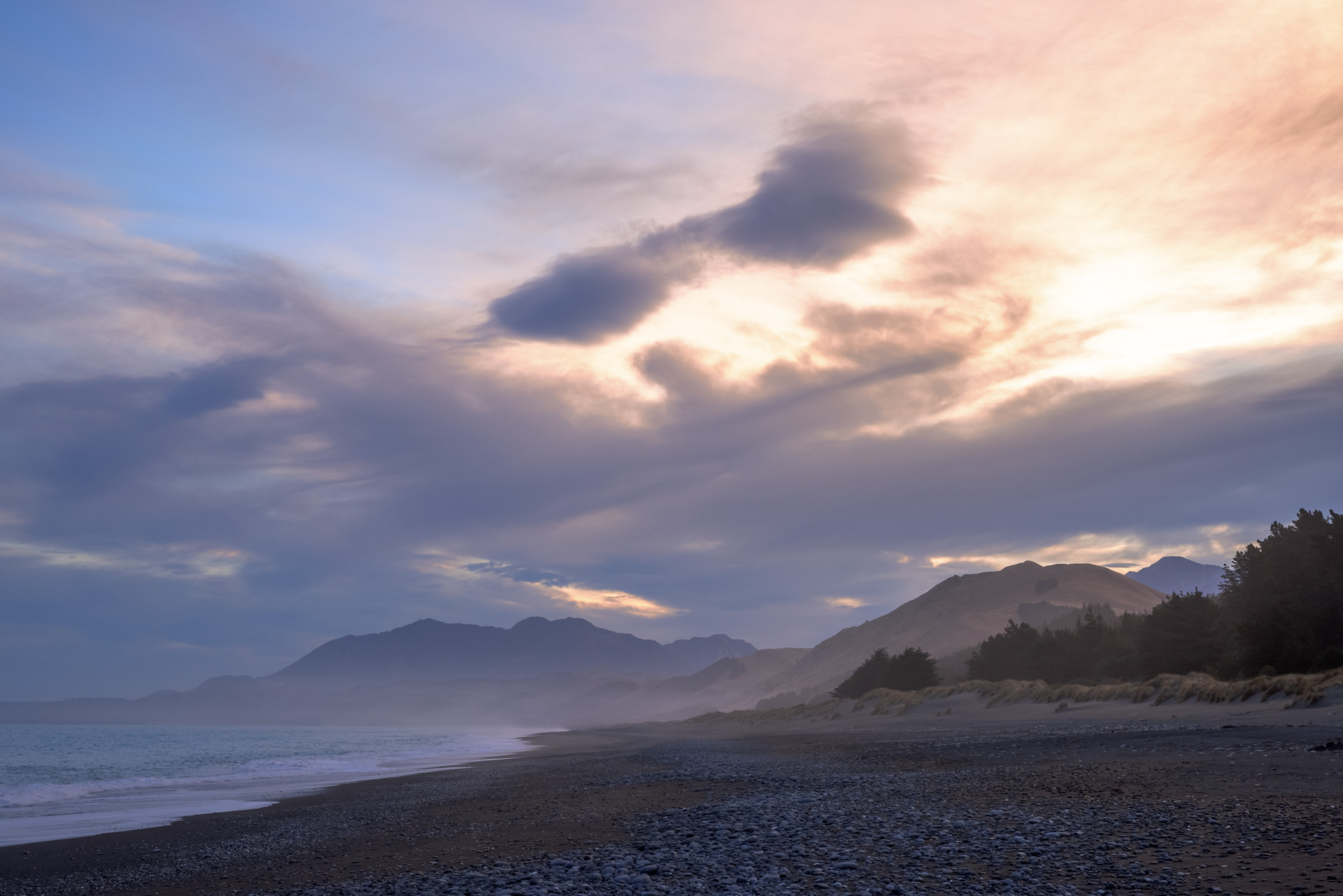 I am getting my daily aerobics jumping down from the van and opening and closing the various farm gates every km or so. We round a corner and Chris lets out a stream of expletives. He has caught sight of the iconic lighthouse and it is completely covered in scaffolding. Photography plans foiled, we cut short our stay and head back out onto the road heading south towards Kaikoura. You can freedom camp all along this coastline and we find a lovely spot just off the road parked on the sand dunes on a vast beach, with the coastline disappearing far into the distance.