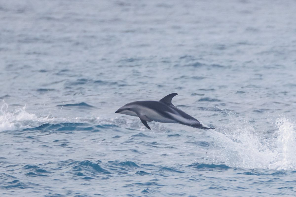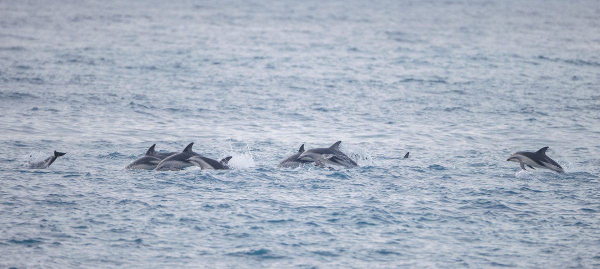 This length of coastline has been reshaped by the earthquake in 2016, with the coastal shelf rising out of the sea and big landslides on the hills wiping out parts of the coastline, including large sections of the road. It is a beautifully calm day and as we drive the repaired coast road towards Kaikoura we spot a huge pod of 50+ dusky dolphins, somersaulting out of the water 100m off the beach, enjoying some serious aqua acrobatics as they travel slowly along the coast.