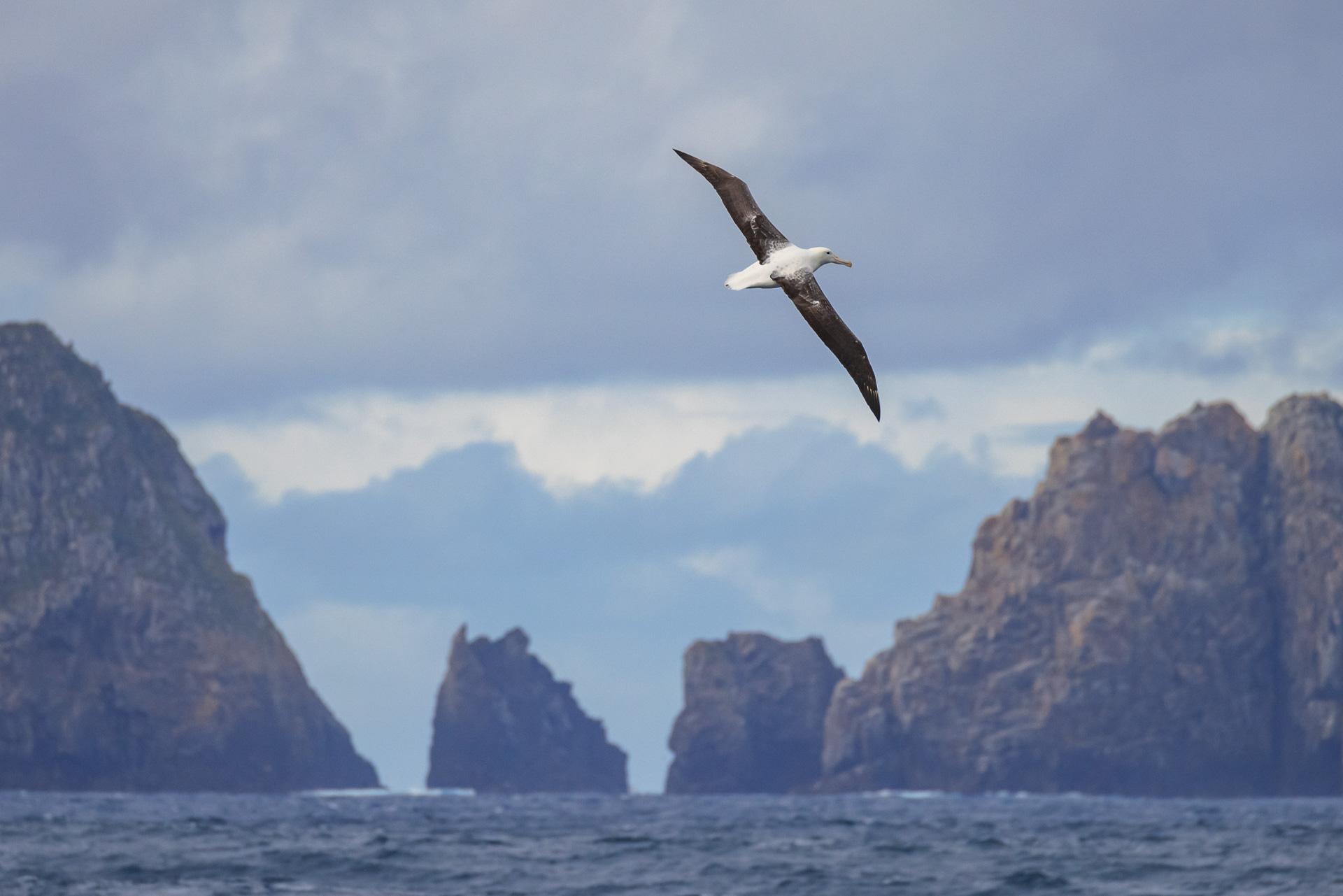 In the Zodiacs, we weaved in and of small bays, caves and through rock arches. Hypnotized by the giant bull kelp with its long fronds attached to the rocks and swinging with the waves like flamenco skirts. The rocks on the shore are covered with Snares crested penguins, small with funky yellow crests on their brows. Higher up on the cliffs the stunning Buller’s albatrosses are nesting. The perfect graduation of white and grey shading on their faces provide such a stark contrast to their bright yellow beaks it looks like pop art.
