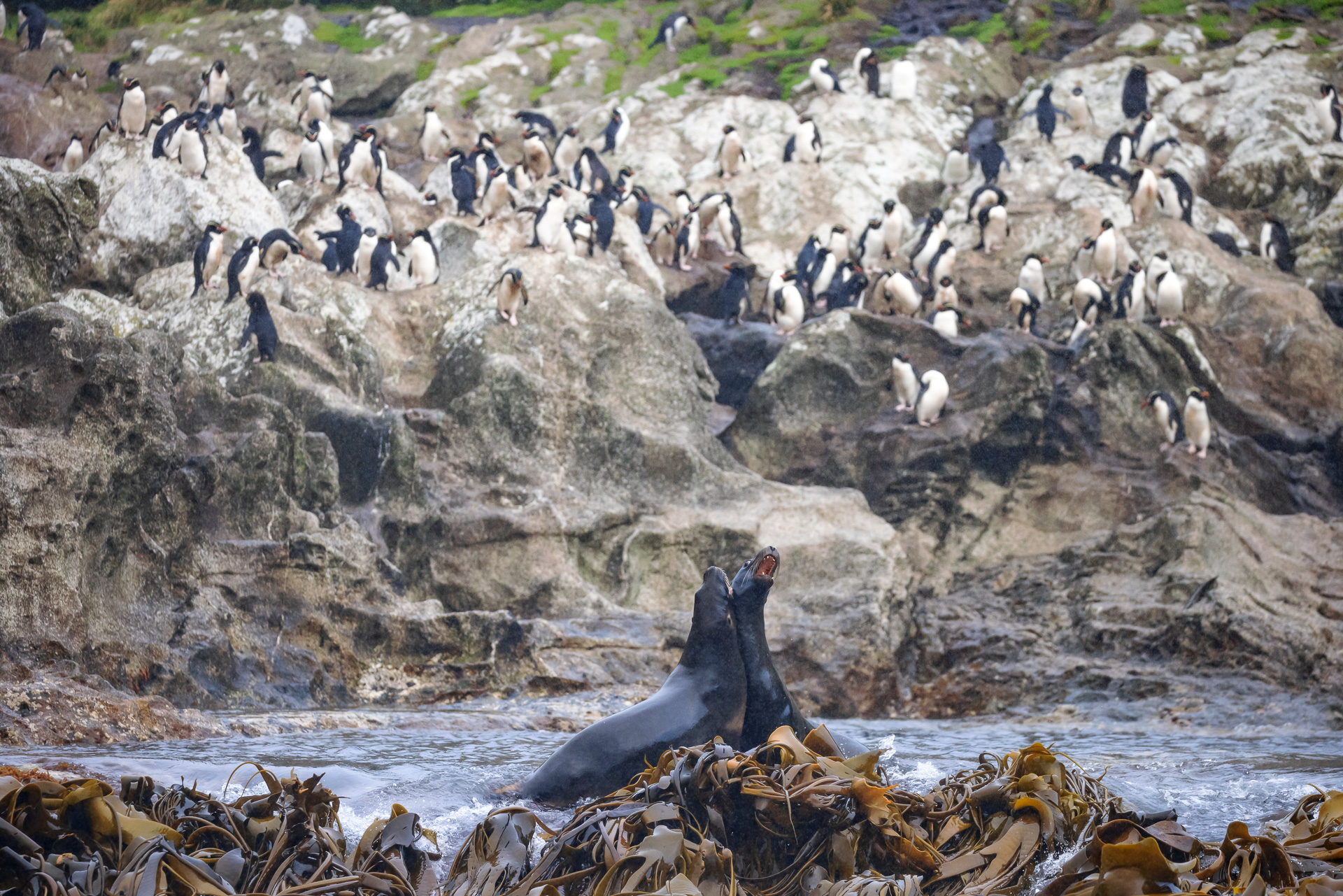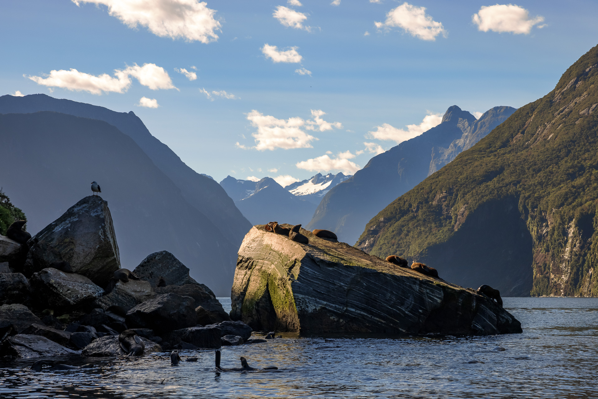 At the narrowest part of the fjord, we come across adolescent male fur seals basking in the sun. This is their favourite haunt as the wind funnels through and makes it the best spot in the sound to avoid the dreaded NZ sandflies.